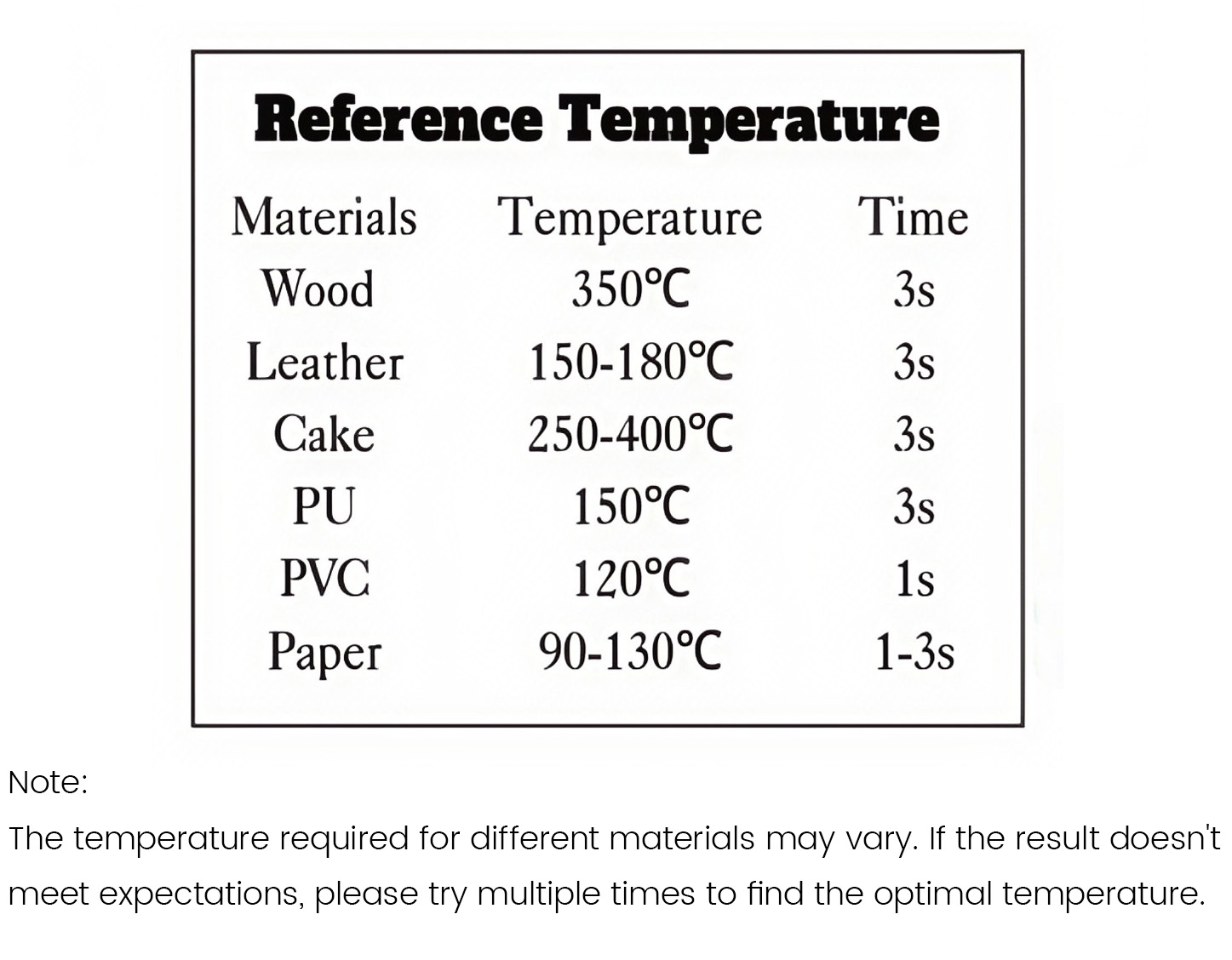 Ease of Use: Simply install the brass stamp, plug it in, and place it on the stand for approximately 8-10 minutes. Brand the surface by holding for 2-5 seconds, and the work is done